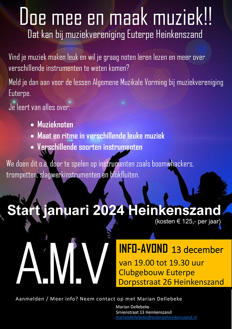 Met ingang van 29 oktober starten we weer met een nieuwe AMV-opleiding. Kinderen vanaf groep 4 zijn van harte welkom. Tijdens deze cursus leren we de beginselen van het muziek lezen op een leuke speelse manier. We doen dit…