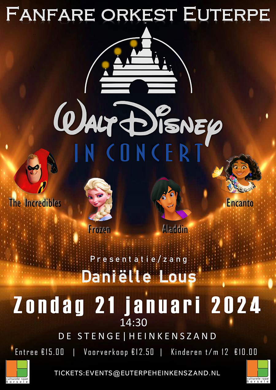 Zondagmiddag 21 januari 2024 neemt fanfareorkest Euterpe je mee in de magische wereld van Walt Disney. De grootste hits uit het omvangrijke Disney repertoire komen voorbij zoals Frozen, Beauty and the Beast, The Incredibles, Encanto en The Aristocats. De middag…