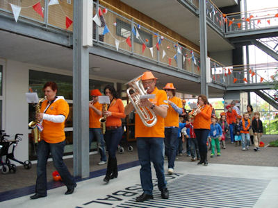 Wat is koninginnedag zonder muziek? Dat is geen Koninginnedag, daarom waren de Zandlopers maandag paraat tijdens de optocht waarin de kinderen van Heinkenszand vanaf het Van der Biltplein via een kleine route door het dorp naar de kinderspelen in de Stenge…