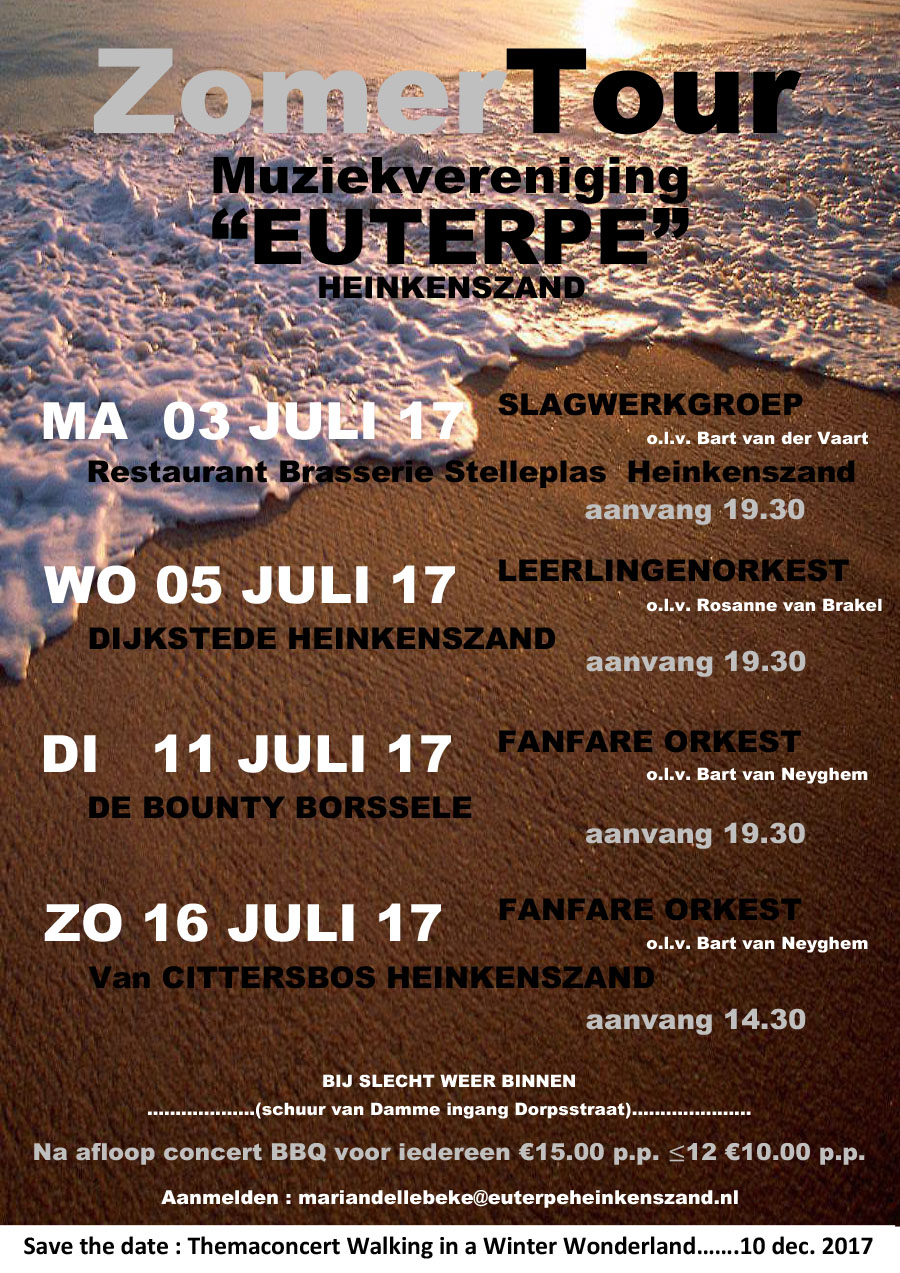 Op maandag 3 juli 2017 start de zomertour van muziekvereniging Euterpe!! Alle onderdelen van de muziekvereniging geven tijdens de zomertour een concert. U bent van harte welkom. Wij vragen uw speciale aandacht voor het Afternoonconcert van zondag 16 juli…
