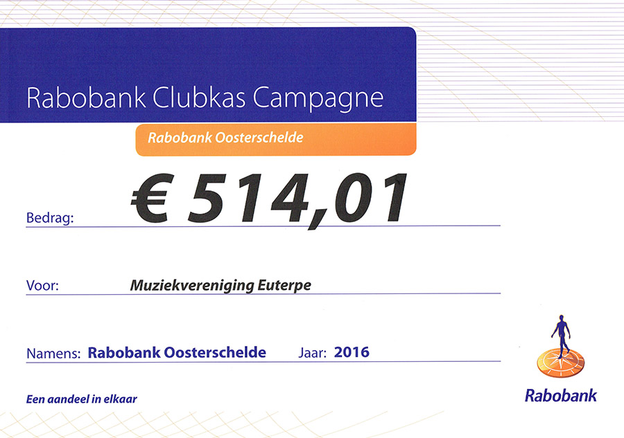 De opbrengst van de Rabobank Clubkascampagne is bekend. Voor Euterpe is er € 514,01. Een mooi bedrag!! Iedereen die heeft gestemd op onze vereniging, hartelijk dank!!!
