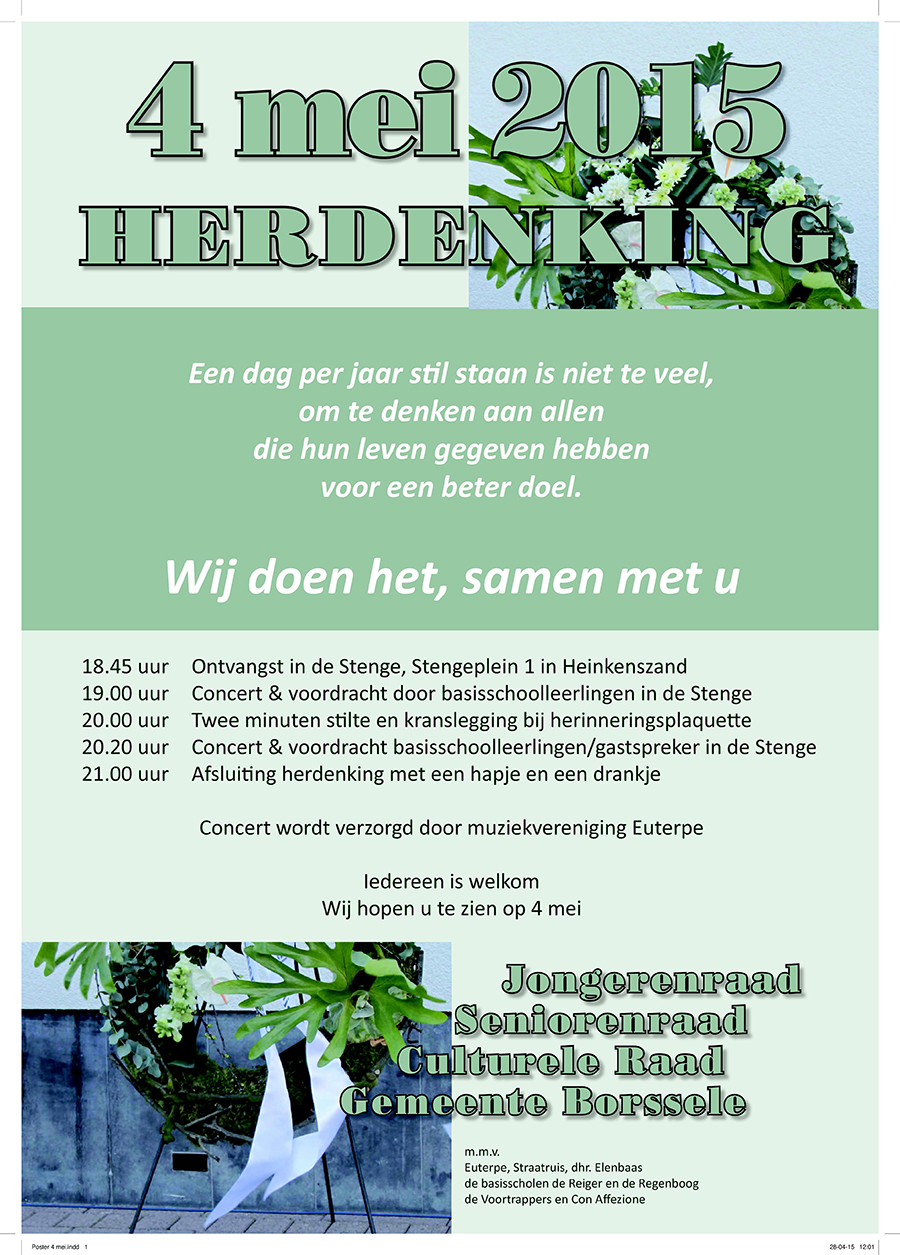 Op 4 mei speelt Euterpe tijdens het herdenkingsprogramma van de gemeente Borsele. Deze organiseert in samenwerking met de Jongerenraad, de Seniorenraad en de Culturele Raad een herdenkingsprogramma in de Stenge te Heinkenszand. Behalve muziek van Euterpe is er…